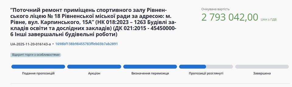 Нагадаємо, майже 3 мільйони гривень втратять на ремонт спортзалу у рівненському ліцеї №18. Відповідний тендер опублікували на сайті «Прозорро».