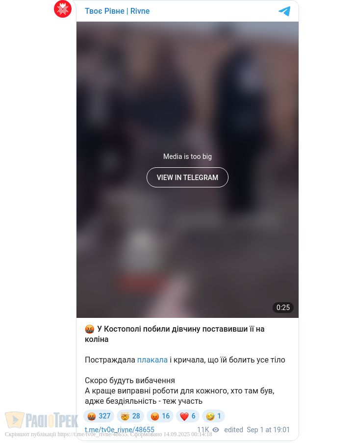 На Рівненщині школярі зняли на відео, як група підлітків знущається з восьмикласниці. Подія сталася на даху недобудови. На кадрах видно, як дівчина стоїть навколішки, а інша її б’є, довкола чути сміх та крики, йдеться у сюжеті ТСН