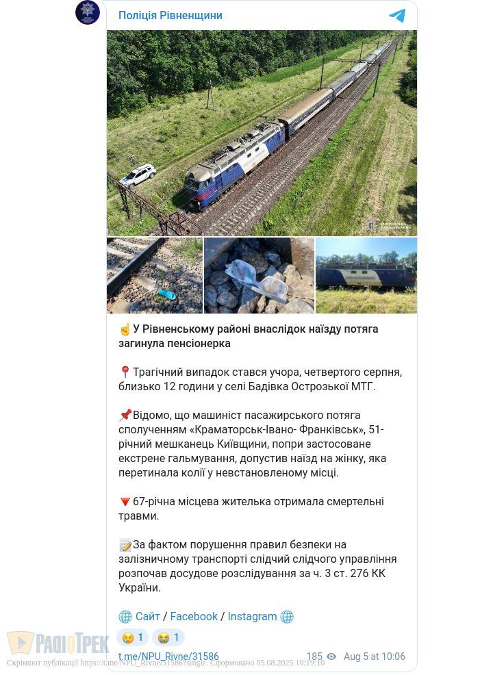 Як повідомили у відділі комунікації поліції Рівненщини, машиніст пасажирського потяга сполученням «Краматорськ-Івано- Франківськ», 51-річний мешканець Київщини, попри застосоване екстрене гальмування, допустив наїзд на жінку, яка переходила колії у невстановленому місці.
