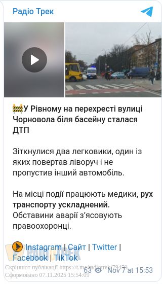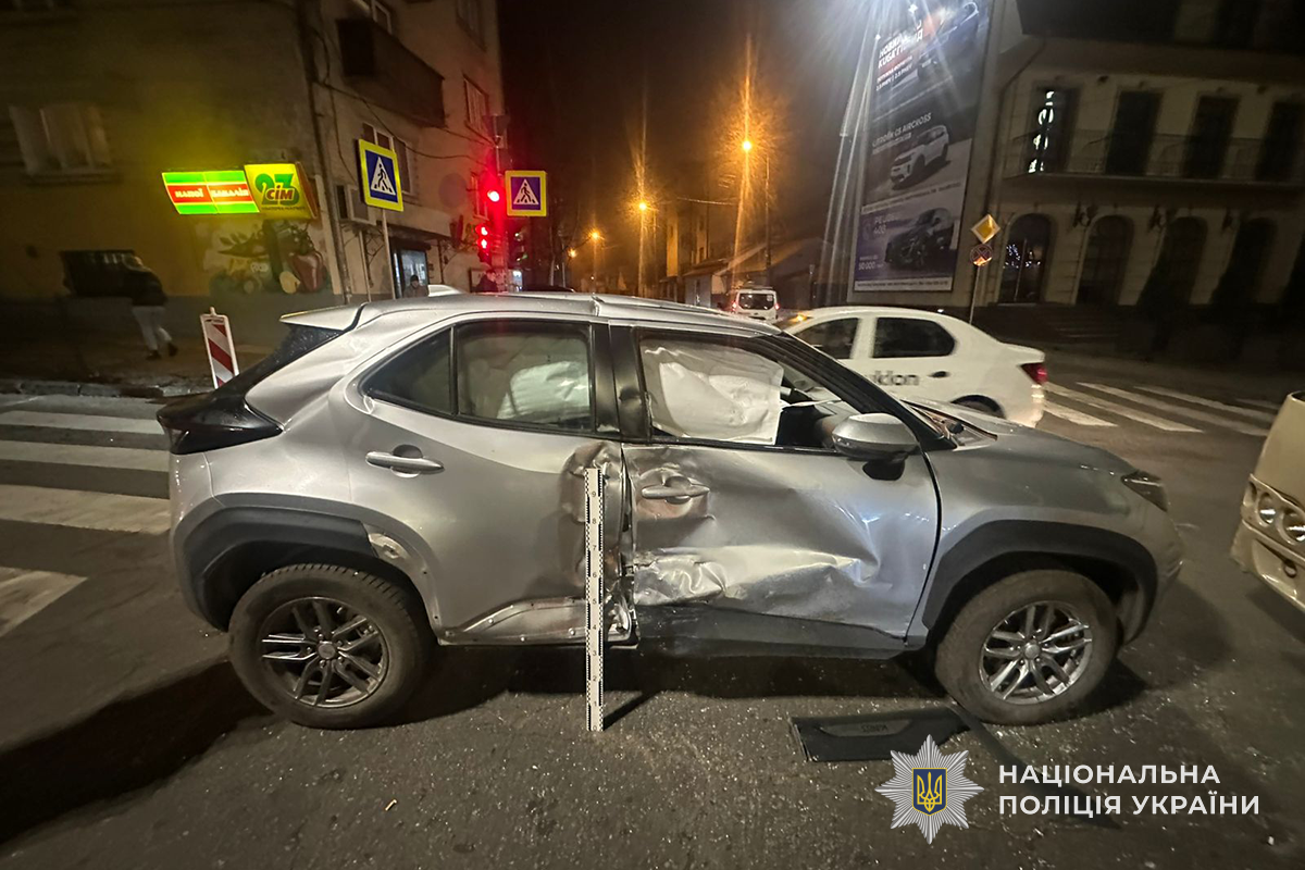 На кадрах відео реєстратора видно, що один із автомобілів повертав ліворуч і тоді сталося зіткнення.