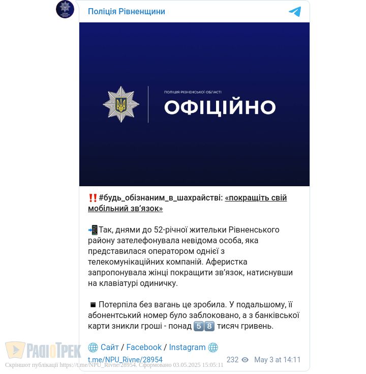 52-річна потерпіла без вагань це зробила. Надалі її абонентський номер заблокували, а з банківської карти зникли кошти.