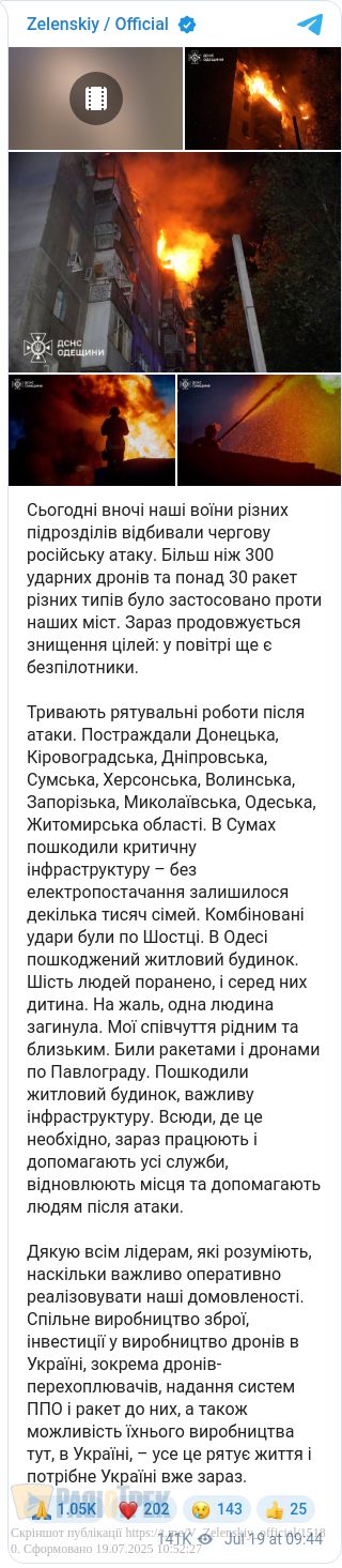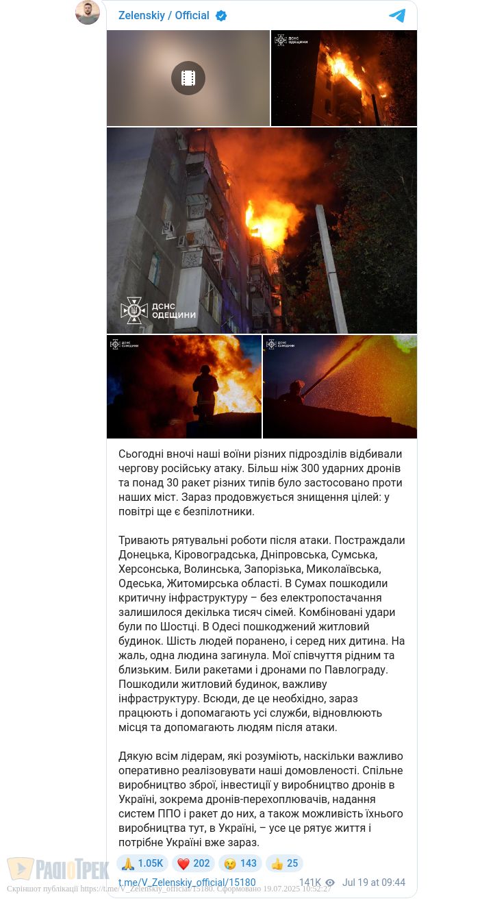 Як повідомив президент Володимир Зеленський, вночі в Україні було понад 300 ударних дронів та більше як 30 ракет різних типів.