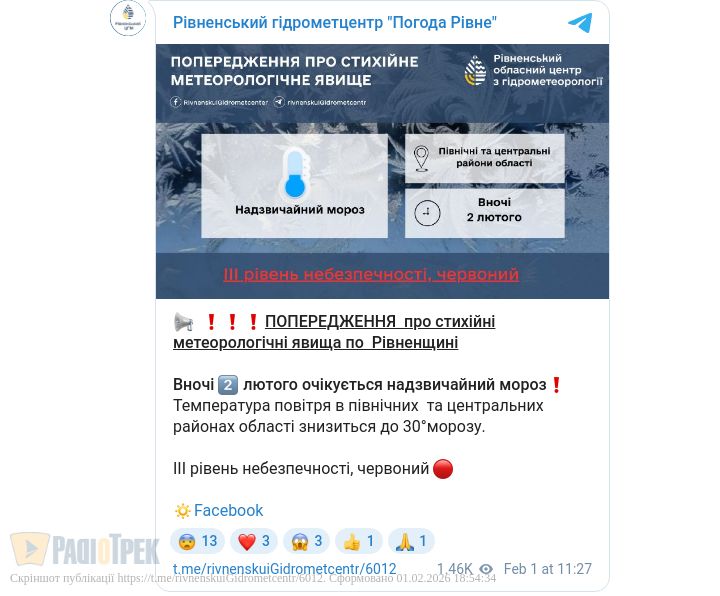 Найближчої ночі Рівненщину накриють надзвичайні морози.