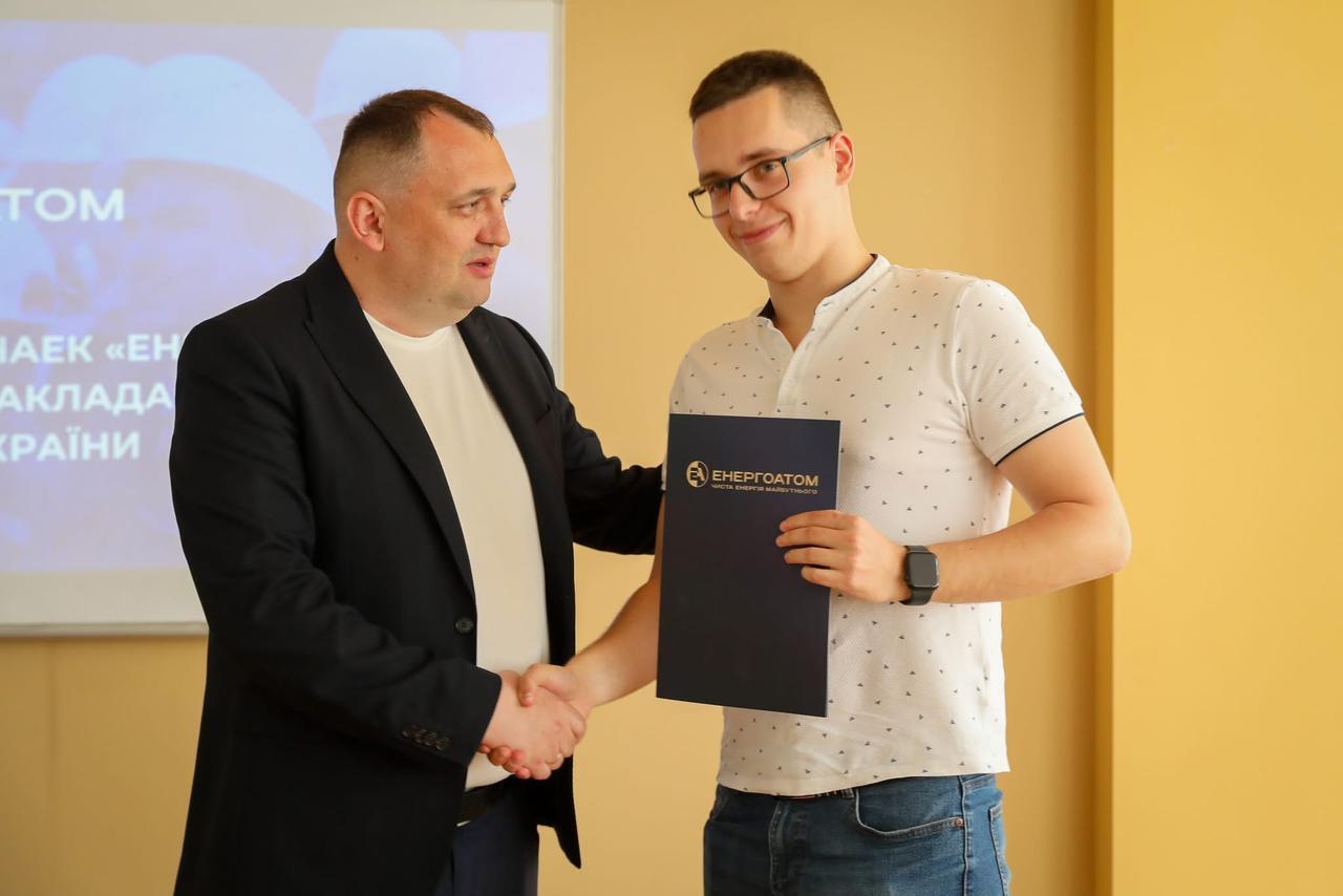 Вручення диплому Назару Вознюку Богданом Шмигельським (виконавчий директор з персоналу АТ НAЕК «Енергоатом»)