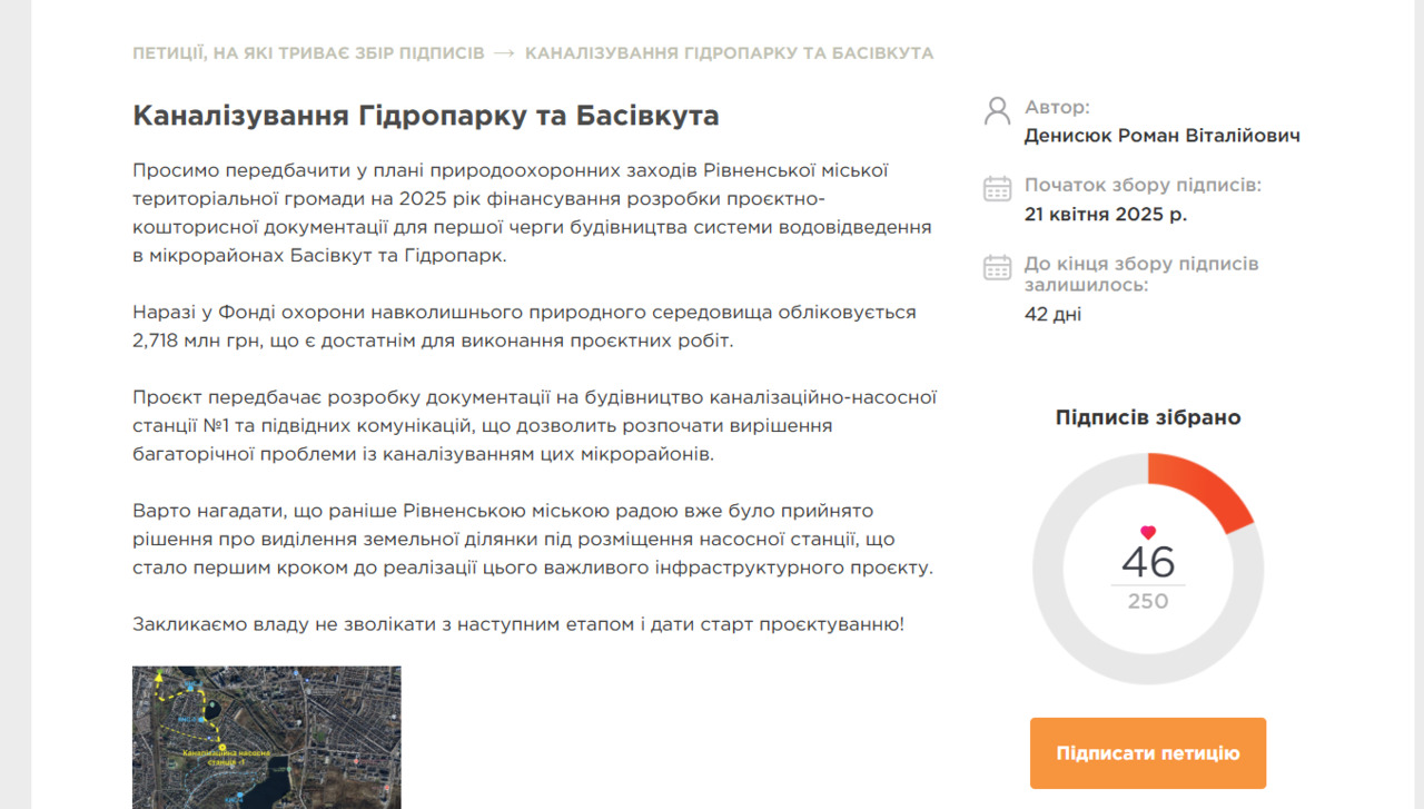 Рівняни просять каналізувати Гідропарк та Басів Кут. У відповідній петиції автор закликає виділити цього року кошти на розробку проєктно-кошторисної документації для першої черги будівництва системи водовідведення.