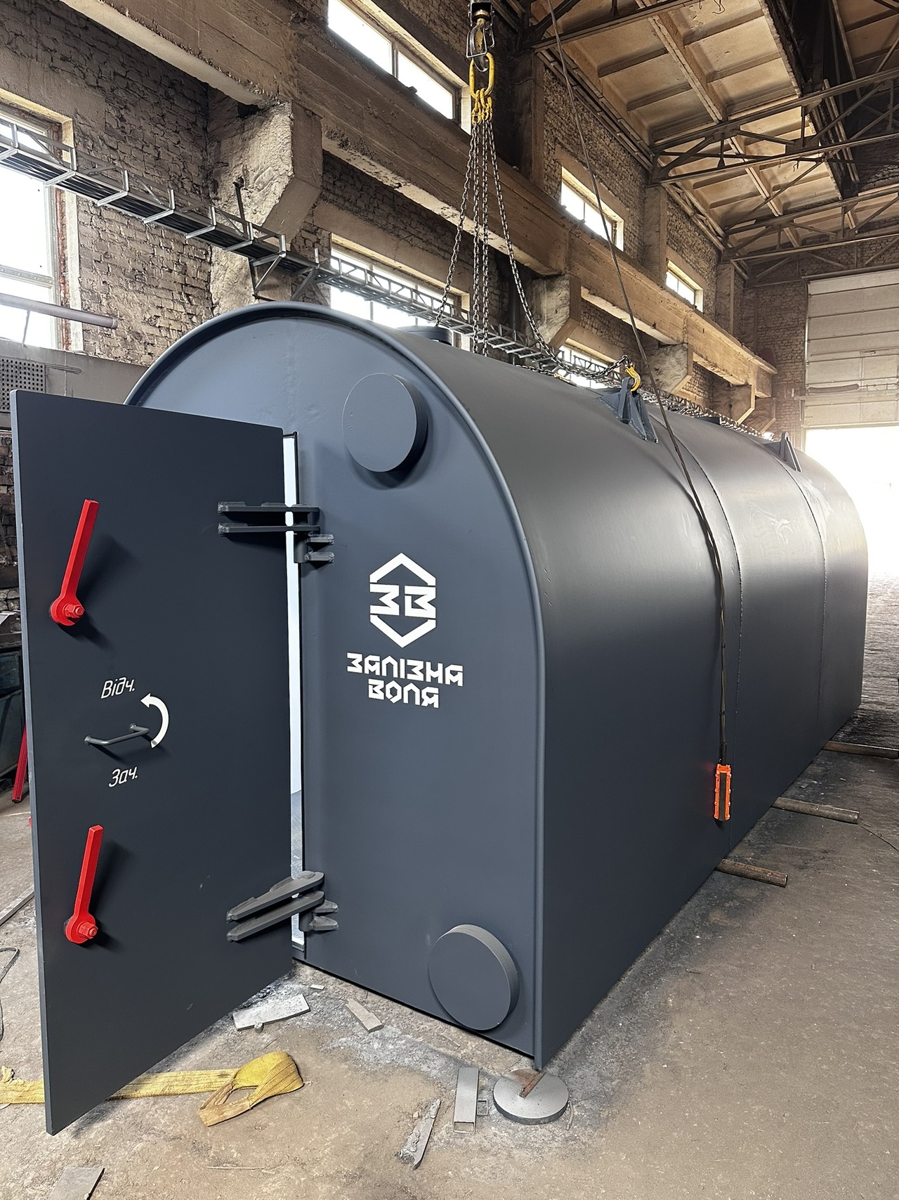Укриття на 10 людей. Підходить і для приміщень, і для вулиці. Завдяки круглій формі збільшує шанс рикошету від уламків чи куль. Товщина металу — 20 мм. Його обирають підприємці, щоб убезпечити своїх працівників.