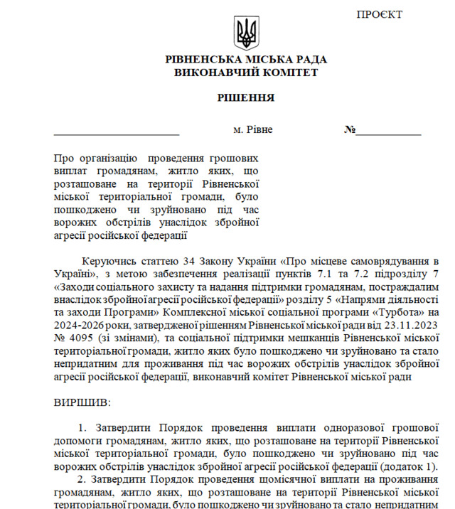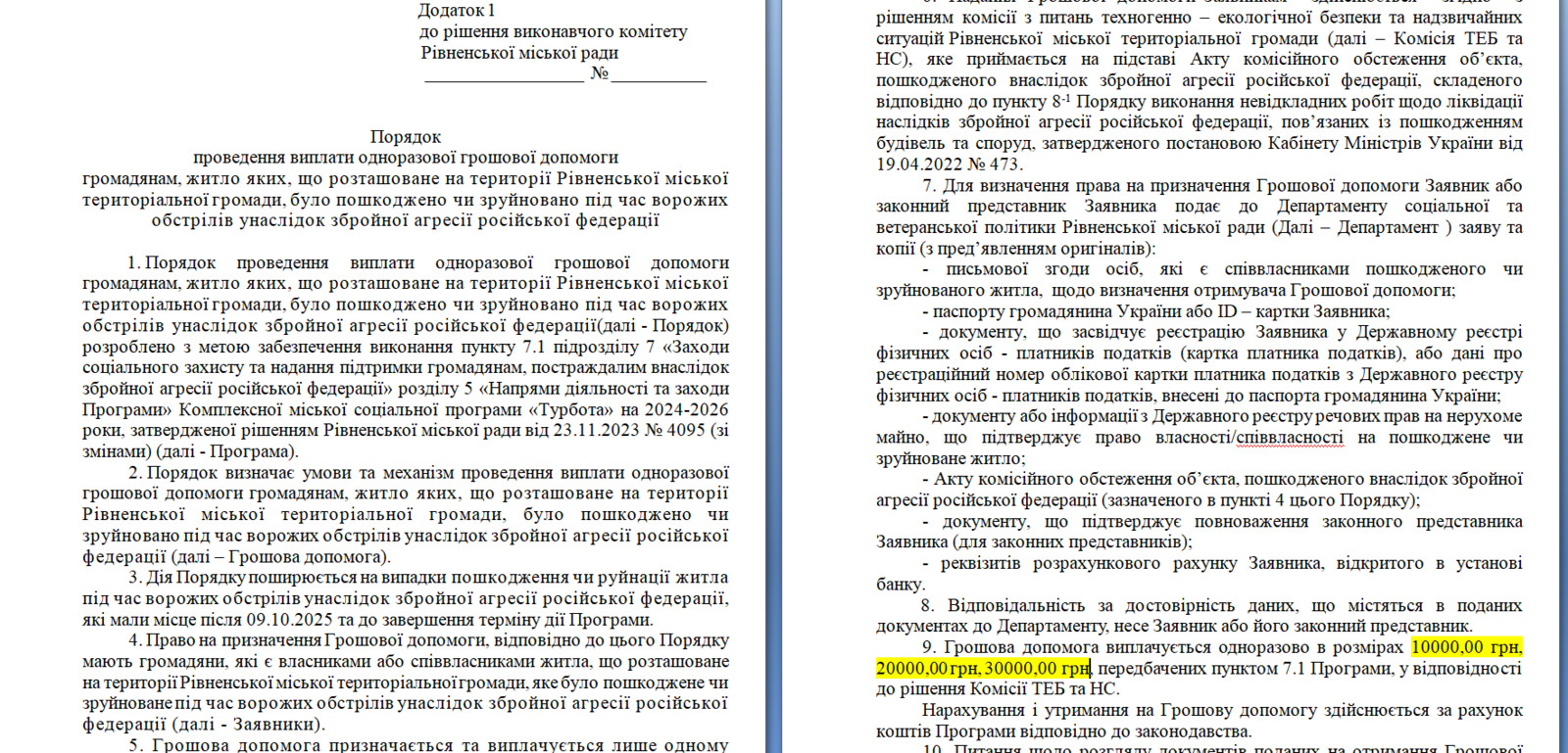 У Рівному планують призначити фінансову допомогу мешканцям тер громади, чиє житло може постраждати під час російських обстрілів. У проєкті рішення виконкому вказано, що одноразова виплата становитиме від 10 до 30 тисяч гривень.