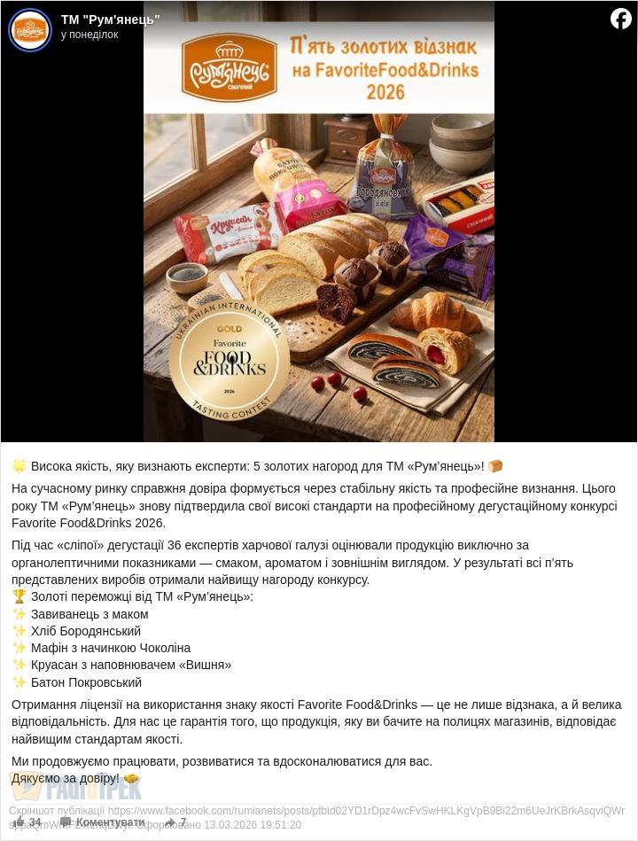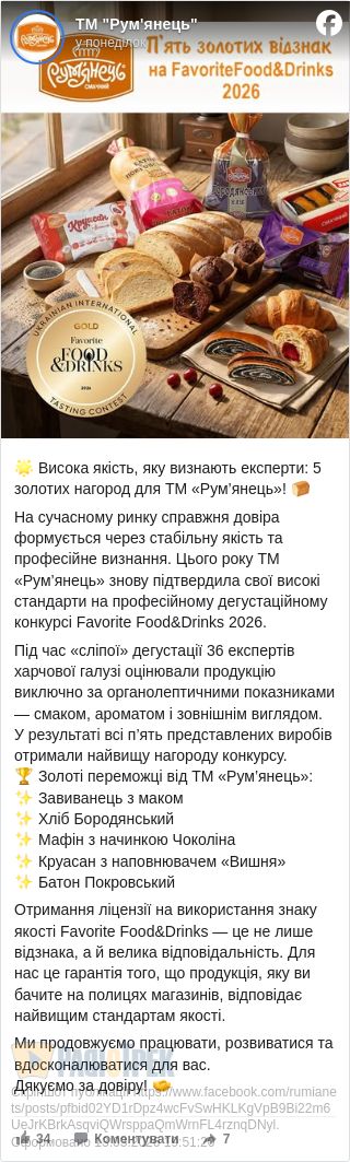 Цього року ТМ «Рум’янець» знову підтвердила свої високі стандарти на професійному дегустаційному конкурсі Favorite Food&Drinks 2026.