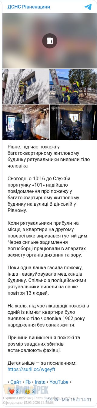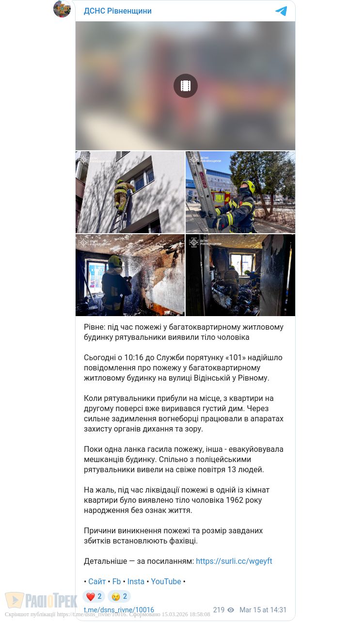 У Рівному під час пожежі в багатоквартирному будинку загинув чоловік. Сьогодні о 10:16 до Служби порятунку «101» надійшло повідомлення про загоряння у будинку на вулиці Відінській.