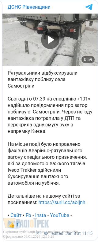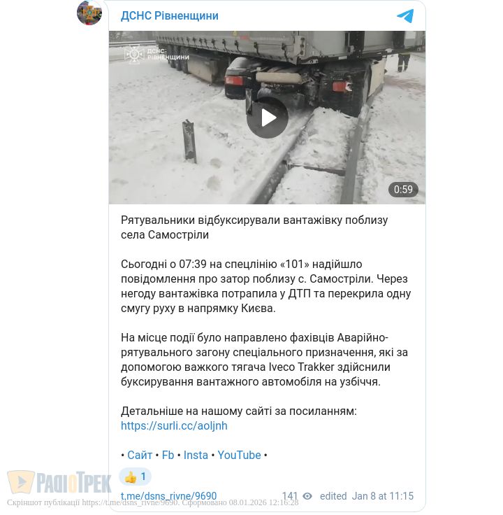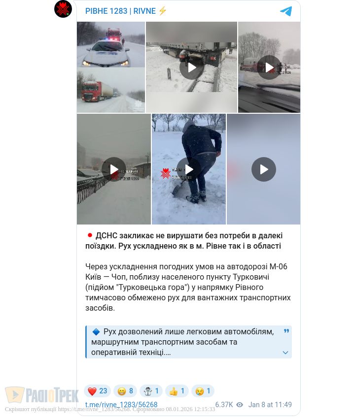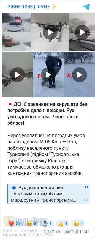 Попри роботу снігоочисної техніки, негода вже спричинила аварійні ситуації. Зокрема, вранці рятувальники ДСНС визволяли вантажівку зі снігових заметів на трасі Київ—Чоп біля села Самостріли.