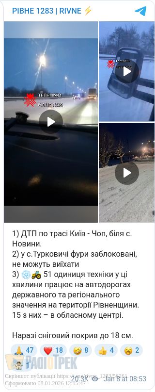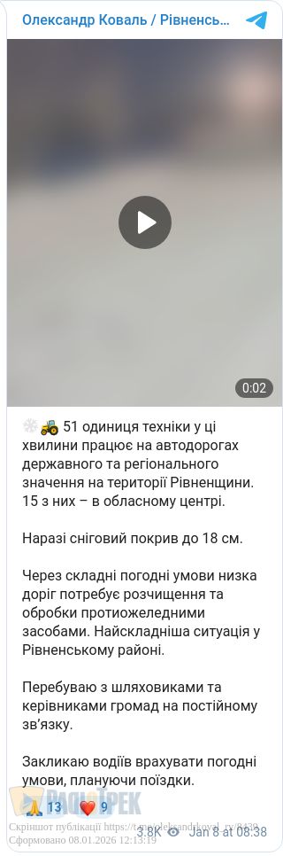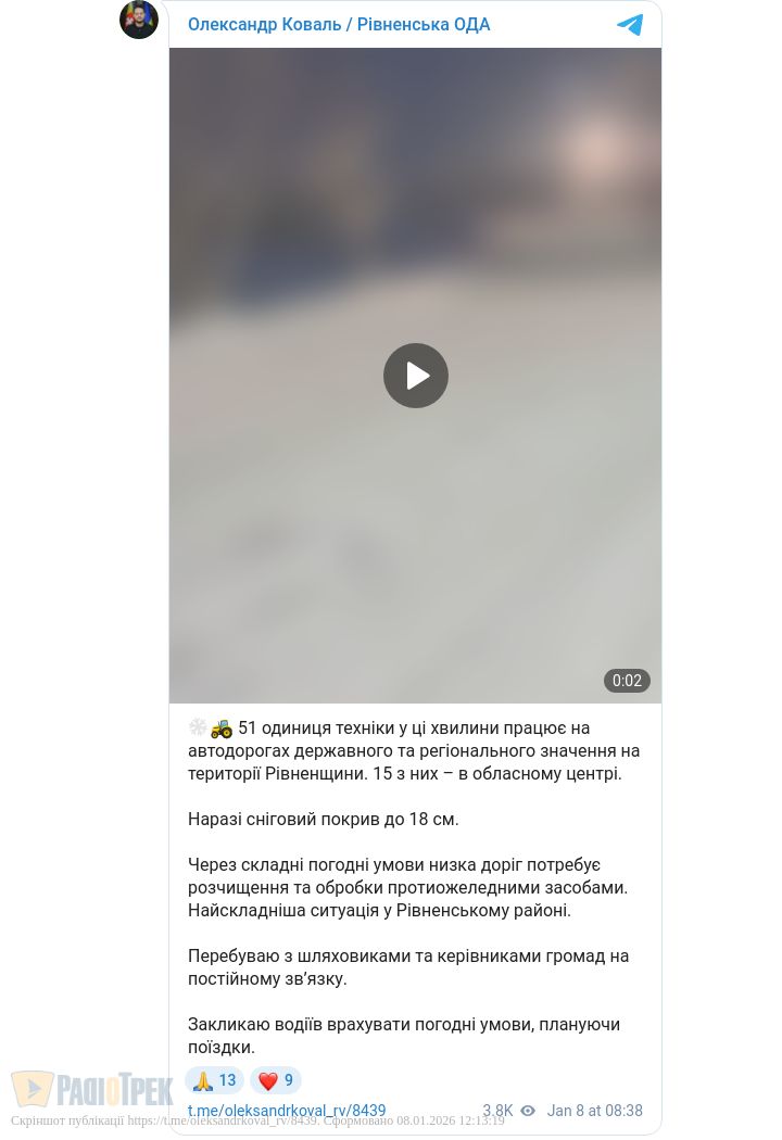 Наразі сніговий покрив місцями сягає до 18 см. На автошляхах області працює 51 одиниця спецтехніки, з них 15 — у Рівному.