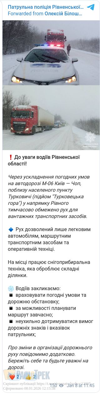 На трасі М-06 Київ—Чоп патрульна поліція тимчасово заборонила рух вантажівкам на ділянці поблизу Турковичів, на підйомі «Турковецька гора». Легкові авто, маршрутки та спецтехніка можуть рухатися без обмежень.