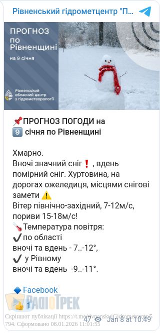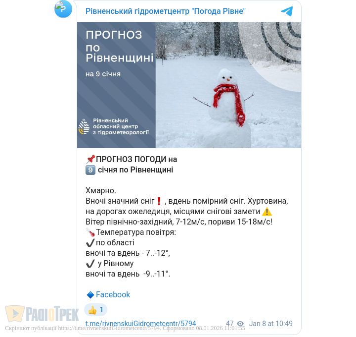 Найближчої ночі пройде сильний сніг, який вдень зміниться на помірний, повідомили у Рівненському обласному гідрометцентрі.