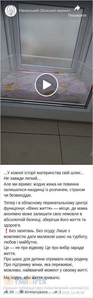 Напиши у моєму форматі на радіо до 70 слів: Ще одне «Вікно життя» відкрили у Рівному. Його облаштували в обласному перинатальному центрі на вулиці Міцкевича біля готелю «Мир».