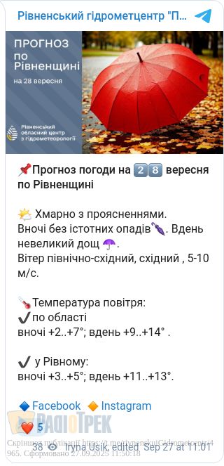 В неділю, 28 вересня, на території Рівненської області очікується типова для осені погодна ситуація — зниження температури, хмарність та незначні опади.