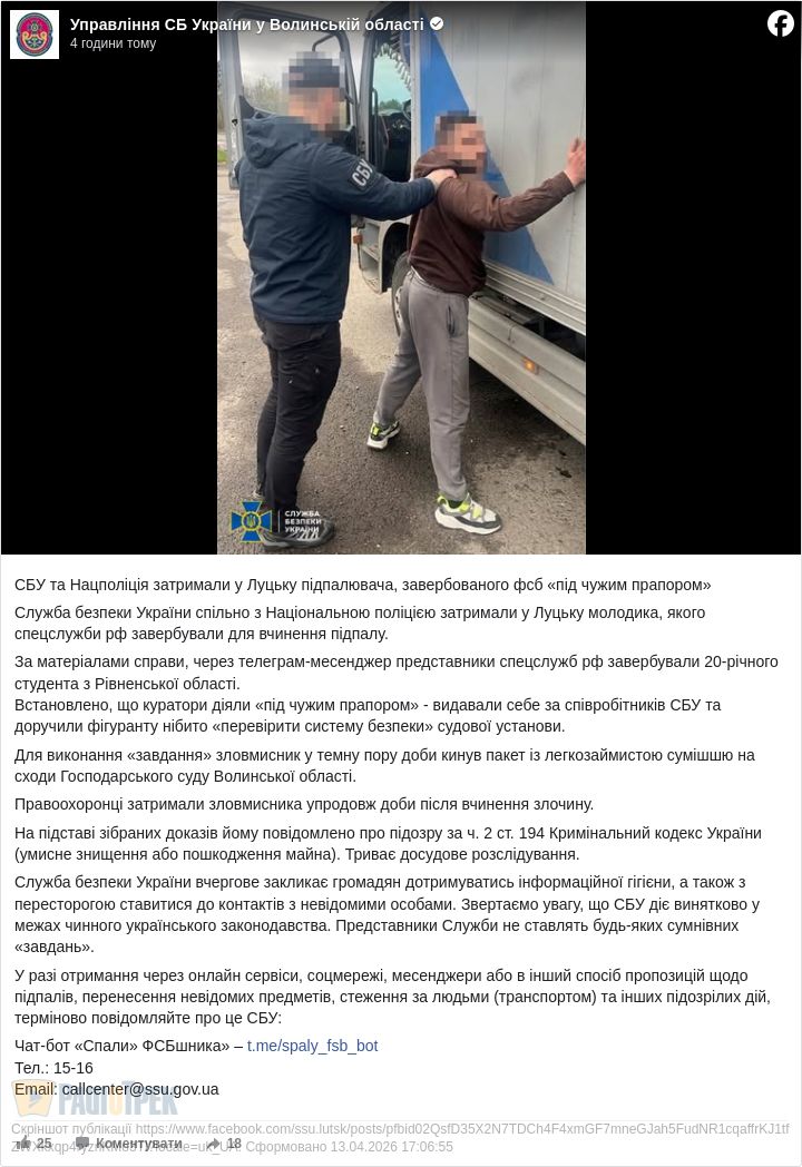 СБУ затримали у Луцьку 20-річного студента з Рівненщині, якого російські спецслужби завербували для вчинення диверсії.