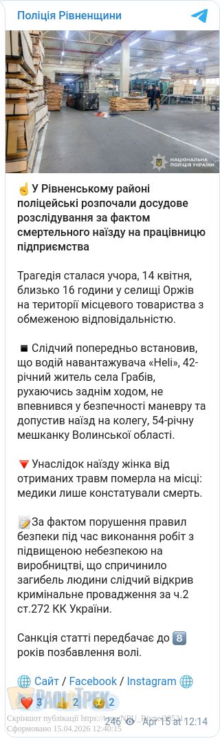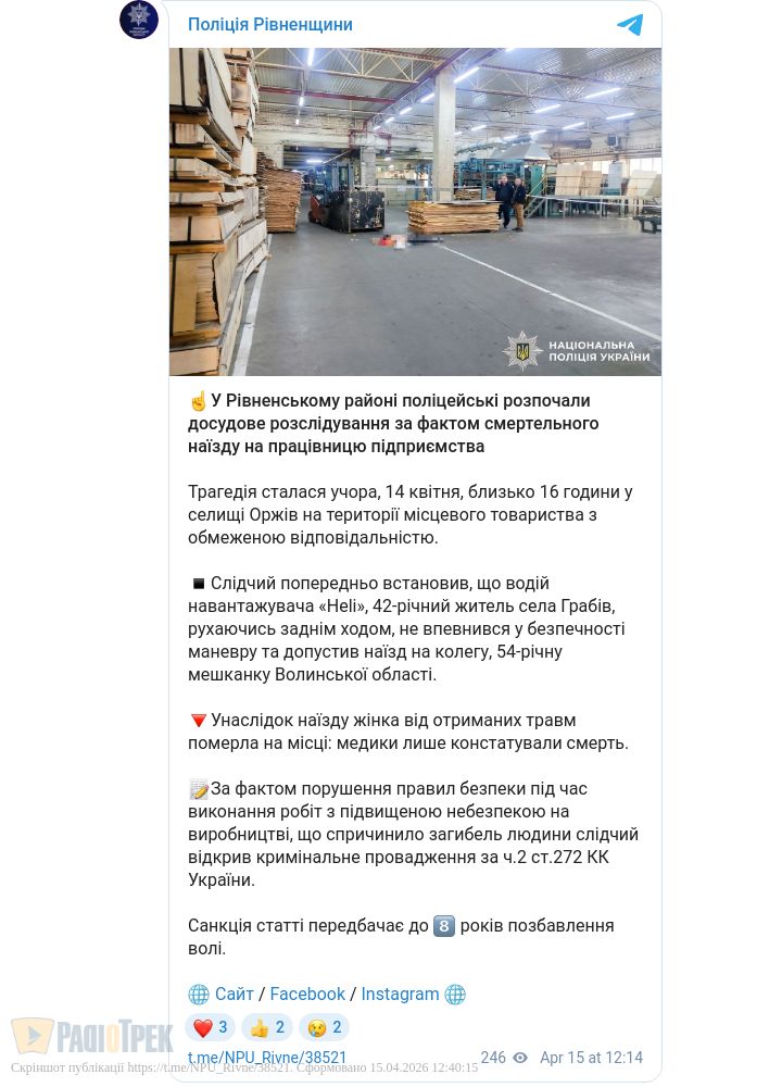 На підприємстві біля Рівного загинула працівниця. Трагедія сталася 14 квітня в селищі Оржів.