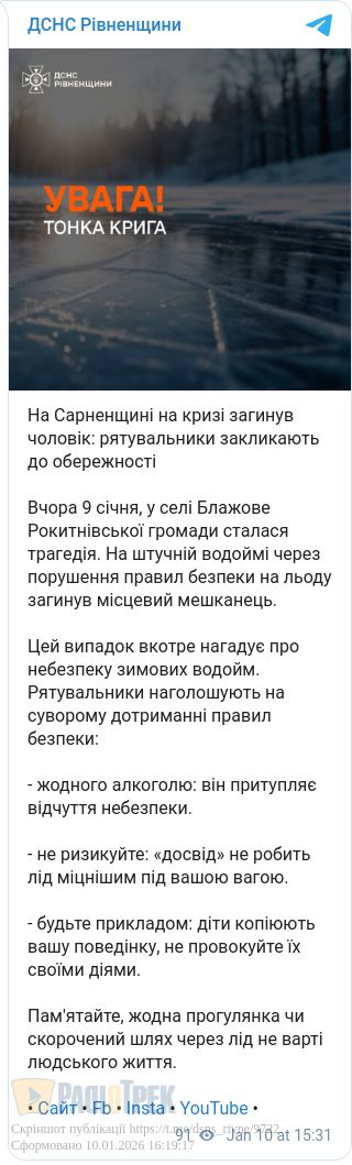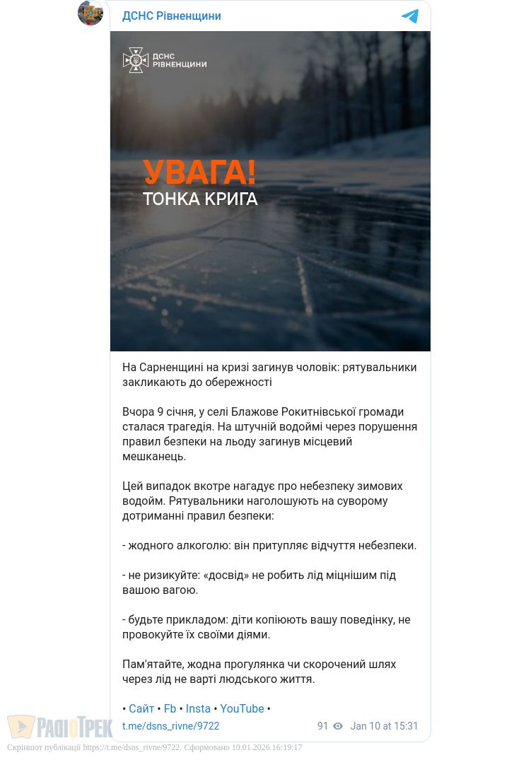 Через порушення правил безпеки на льоду загинув чоловік. Смертельна трагедія сталася на штучній водоймі у селі Блажове на Сарненщині 9 січня.