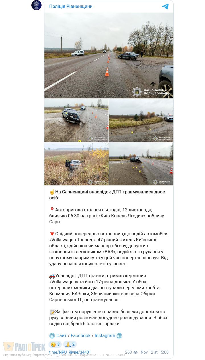 На Сарненщині у ДТП травмувалися батько та донька. Аварія сталася сьогодні, 12 листопада, близько 06:30 на трасі «Київ–Ковель–Ягодин» поблизу Сарн.