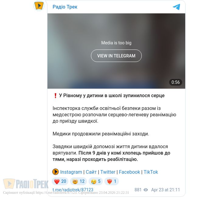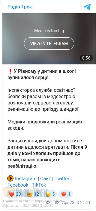 У одній зі шкіл Рівного сталася критична ситуація — під час перебування в навчальному закладі дитина знепритомніла, у неї зник пульс і з’явилися ознаки зупинки дихання.
