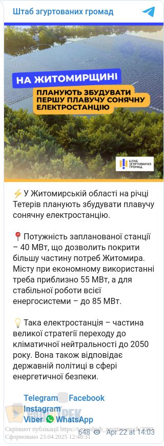 На Житомирщині мають намір побудувати плавучу сонячну електростанцію (СЕС). Очікується, що її потужність становитиме 40 МВт, чого має вистачити для забезпечення більшої частини потреб Житомира.