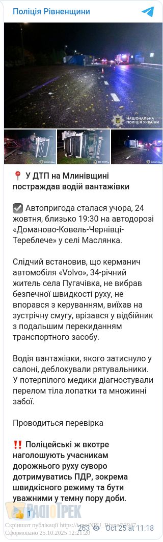 У ДТП на Млинівщині постраждав водій вантажівки. Автопригода сталася учора, 24 жовтня, близько 19:30 на автодорозі «Доманово-Ковель-Чернівці-Тереблече» у селі Маслянка.