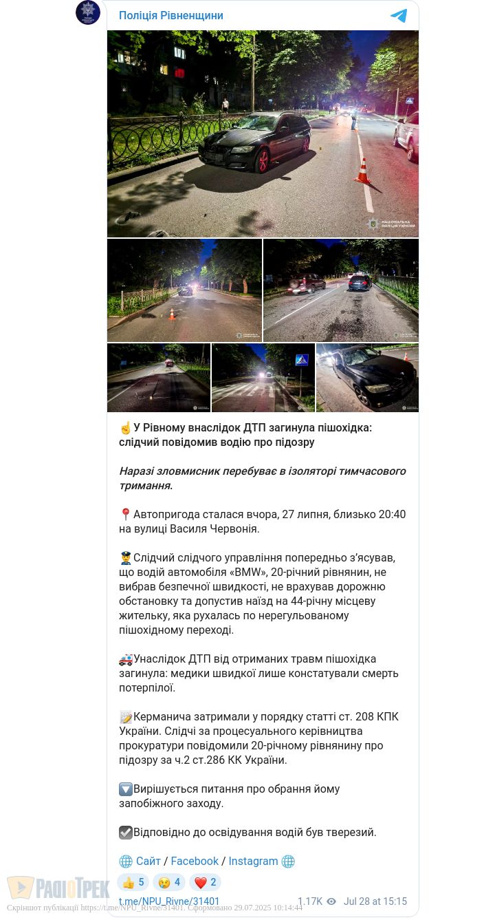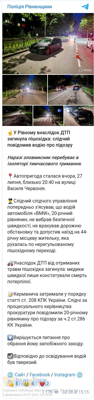 Нагадаємо, у поліції області повідомили, що 27 липня близько 20:40 водій автомобіля BMW, 20-річний рівнянин, не вибрав безпечної швидкості, не врахував дорожню обстановку та збив рівнянку, яка йшла по нерегульованому пішохідному переході.