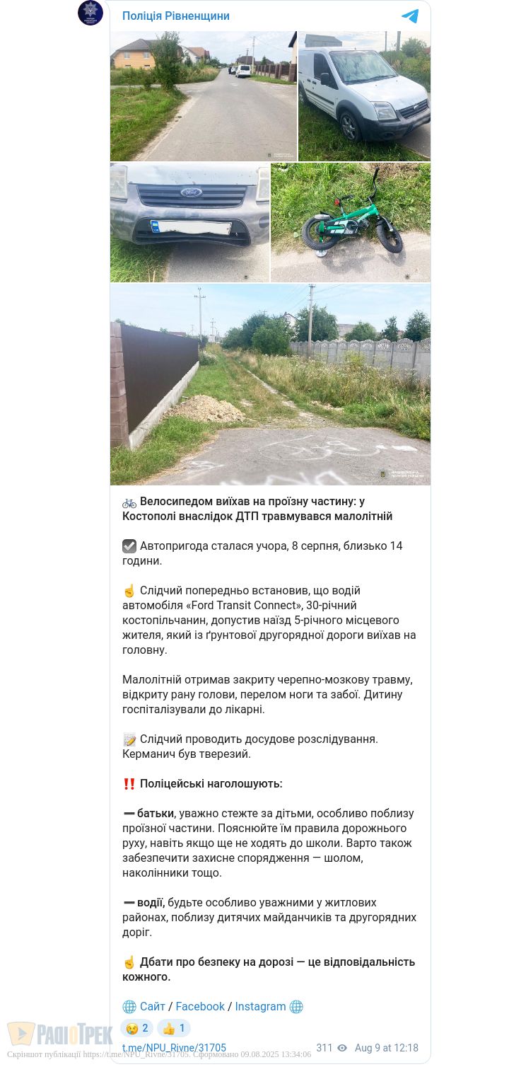 Слідчий попередньо встановив, що водій автомобіля «Ford Transit Connect», 30-річний костопільчанин, збив 5-річного хлопчика, який із ґрунтової другорядної дороги виїхав на головну.