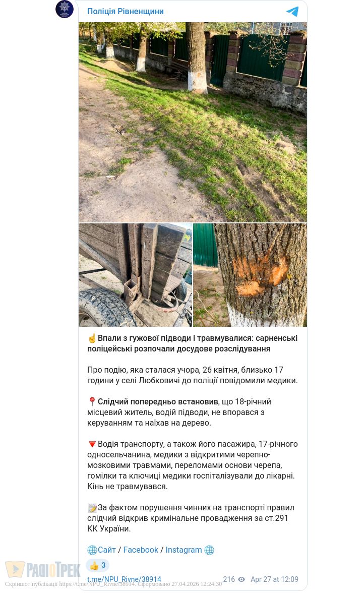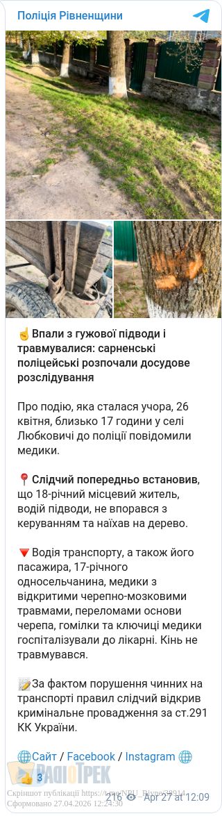 Двоє юнаків тяжко травмувалися внаслідок падіння з гужової підводи на Сарненщині. ДТП сталася напередодні у селі Любковичі.