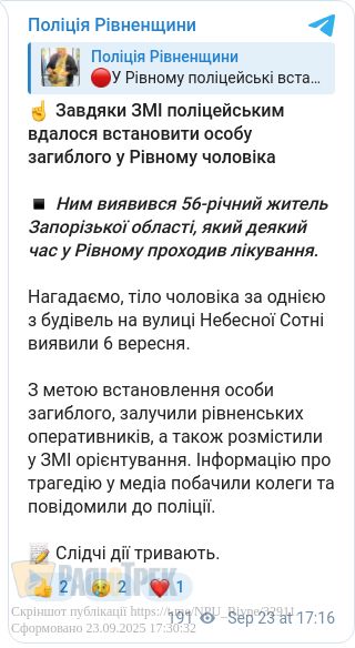 Завдяки ЗМІ поліцейським вдалося встановити особу загиблого у Рівному чоловіка Ним виявився 56-річний житель Запорізької області, який деякий час у Рівному проходив лікування.