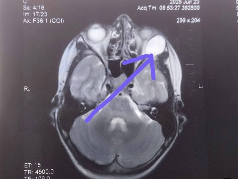 Після проведення МРТ обстеження виявили новоутвір великих розмірів (приблизно 20 мм), який зміщував очне яблуко та викликав у дитини наявні симптоми.