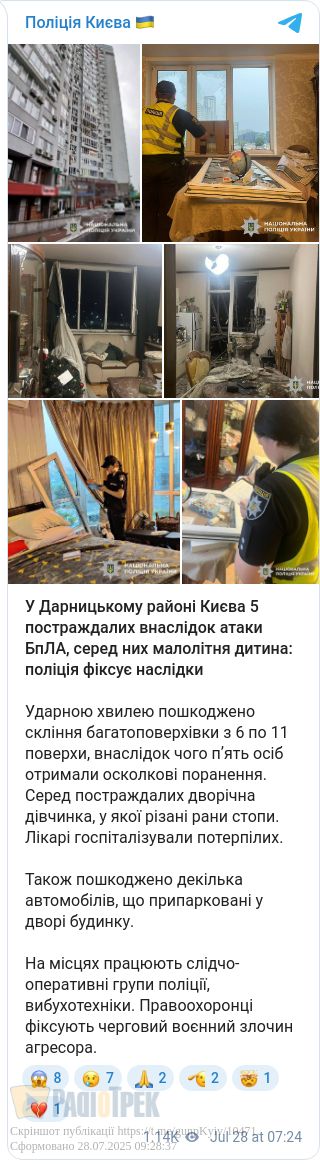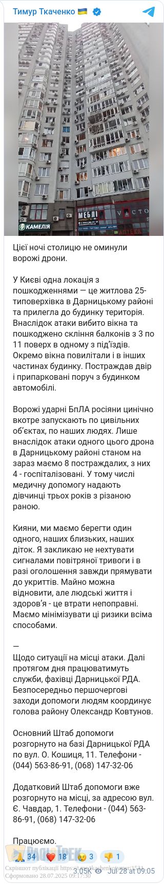 Лише внаслідок атаки одного цього дрона в Дарницькому районі станом на зараз маємо 8 постраждалих, з них 4 – госпіталізовані. У тому числі медичну допомогу надають дівчинці трьох років з різаною раною, – повідомив Тимур Ткаченко.