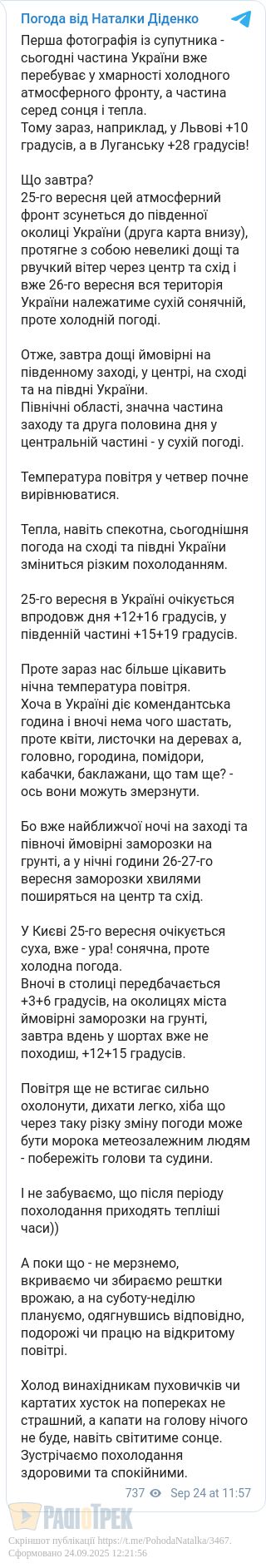 Завтра, 25 вересня, фронт зміститься на південь. У центрі, на сході та півдні можливі невеликі дощі й рвучкий вітер. Натомість північ, більшість заходу та друга половина дня у центрі обійдуться без опадів.