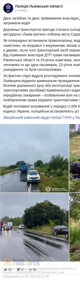 Від отриманих внаслідок ДТП травм пасажирки автомобіля, 23-річна жителькa Рівненської області Іванна Кліценко та 25-річна львів’янка, загинули на місці події, повідомили у поліції Львівщини.