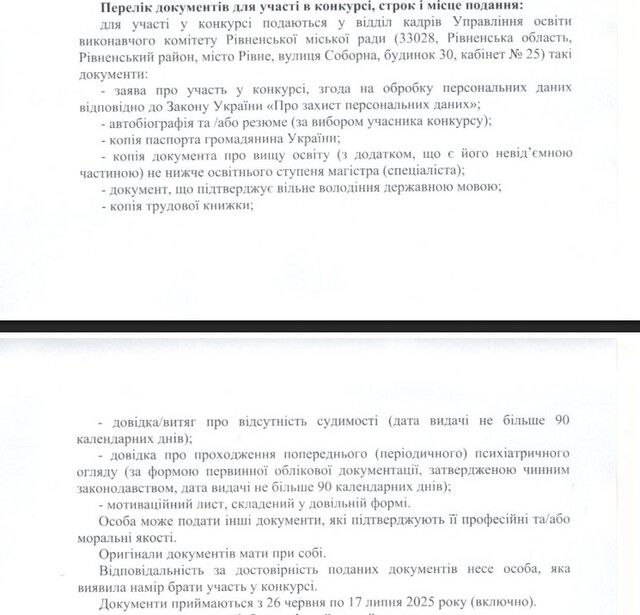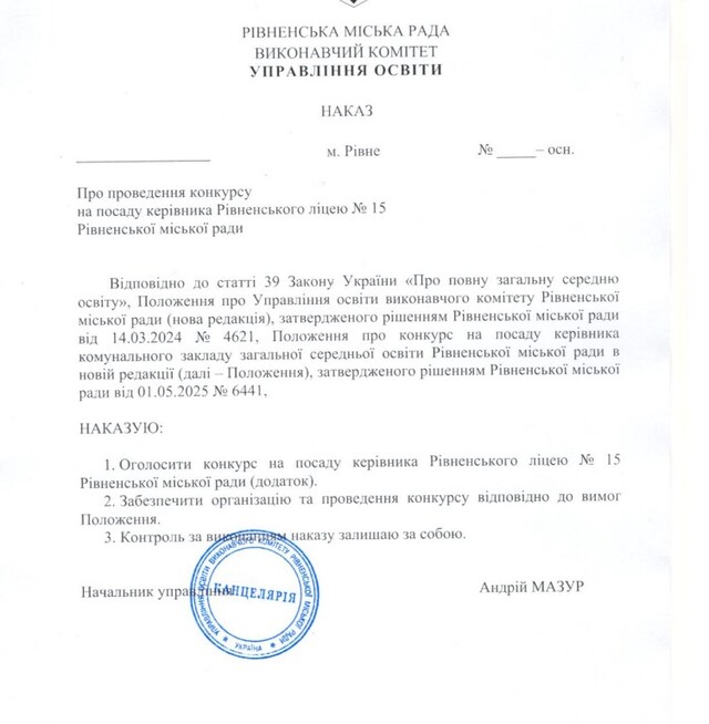У Рівному оголосили конкурс на посаду директора ліцею №15. Інформацію про вакансію оприлюднили на сайті Рівнеради. У наказі Управління освіти зазначено, що прийом документів триватиме з 26 червня до 17 липня включно.