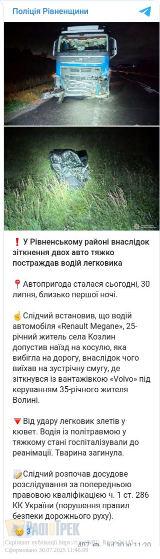 Близько першої години 25-річний водій автомобіля Renault Megane наїхав на косулю, яка вибігла на дорогу. Внаслідок наїзду легковик виїхав на зустрічну смугу, де зіткнувся із вантажівкою Volvo.