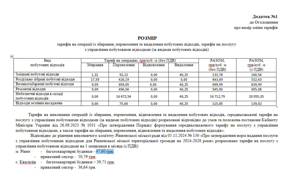 Тарифи на послуги збирання, перевезення та видалення побутових відходів у Рівному можуть зрости одразу на 20 грн. На сайті Рівнеради вказано, що за 6 місяців цього року підприємство 1728 отримало збитків на понад 6,5 мільйона гривень, а чинні тарифи покривають лише 81 % витрат.