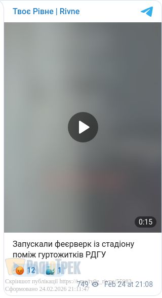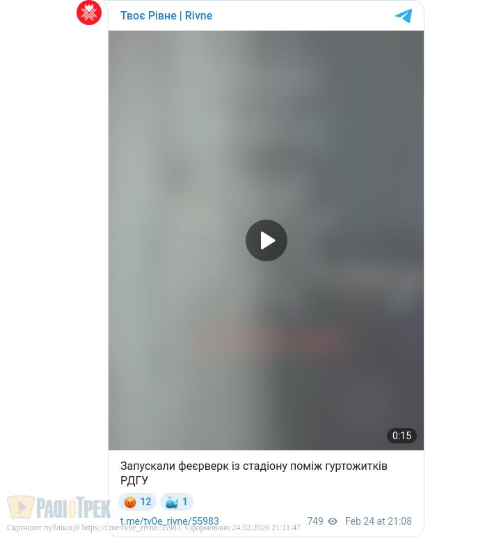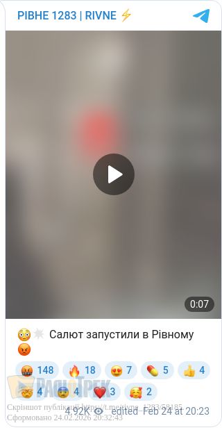 У Рівному запустили салют. Такі повідомлення поширили низка місцевих telegram-каналів. Феєрверк бачили і чули відповідні вибухи мешканці району РДГУ на вулиці Пластовій, неподалік ПДМу.