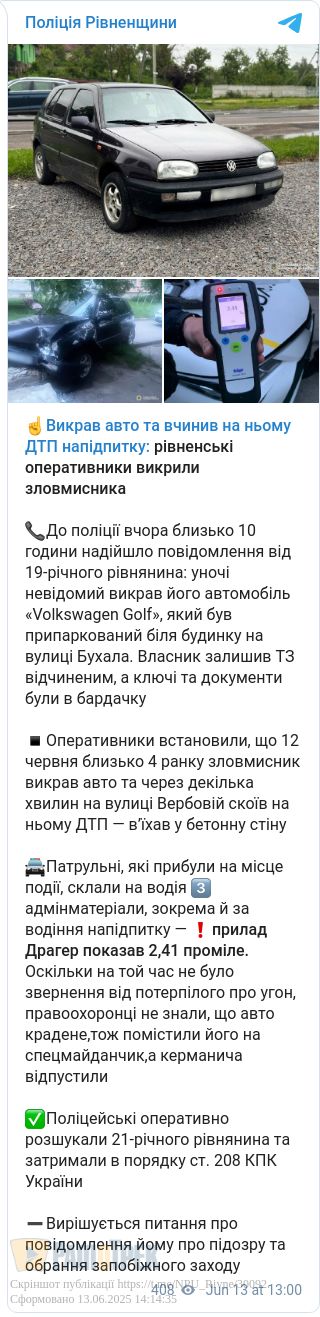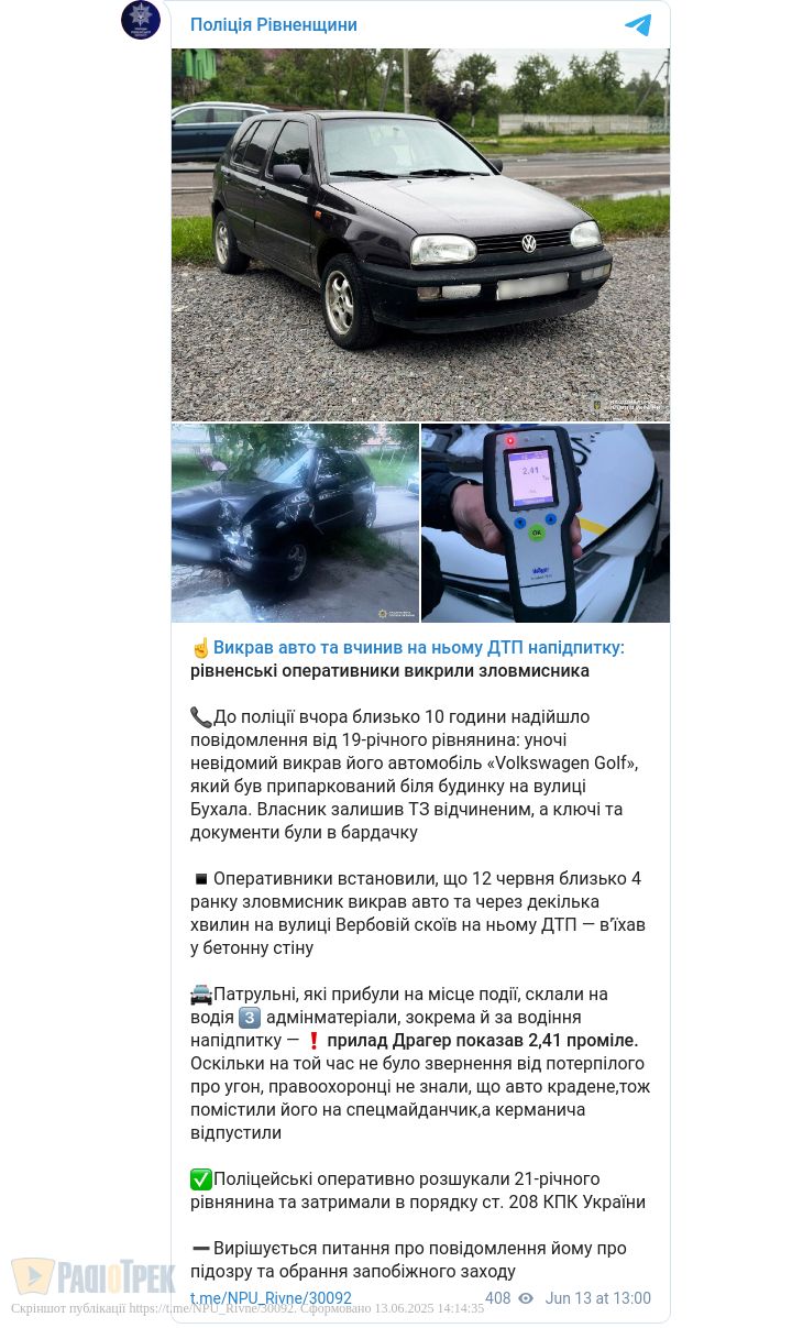 Згодом поліцейські оперативно розшукали 21-річного рівнянина та затримали. Вирішується питання про повідомлення йому про підозру та обрання запобіжного заходу.