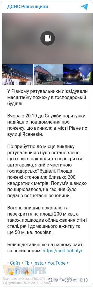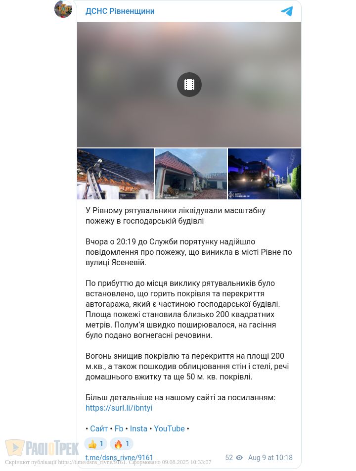 Рятувальники, прибувши на місце події, встановили, що горить покрівля та перекриття автогаража, який є частиною господарської будівлі.