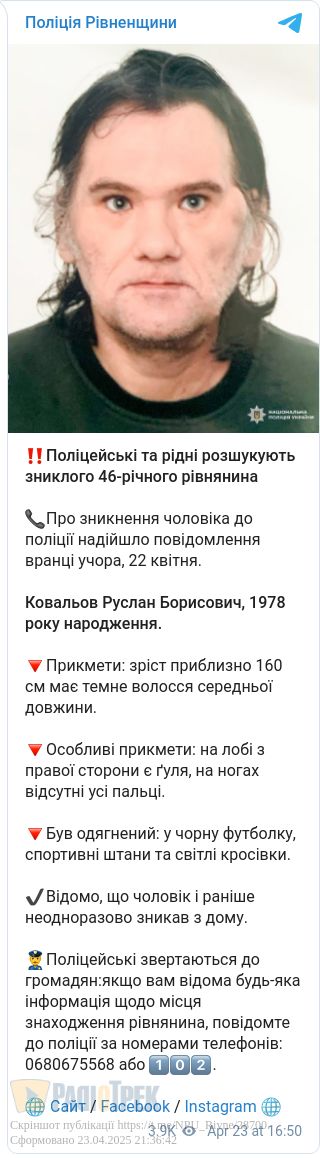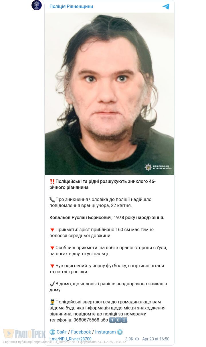 Якщо вам відома будь-яка інформація щодо місця перебування рівнянина, повідомте про це до поліції за номерами телефонів: 068-067-55-68 або 102.
