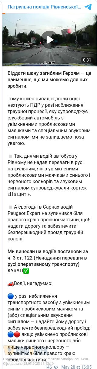 Водій автобуса не пропустив кортеж «На щиті» у Рівному. Днями, патрульні з увімкненими проблисковими маячками та сиреною супроводжували траурну процесію, тоді кермувальник громадського транспорту не надав дорогу колоні та не вшанував Героя.
