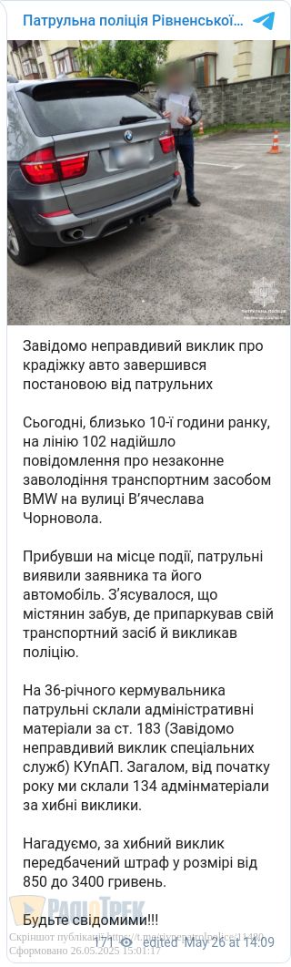 За свідомо неправдивий виклик на 36-річного рівнянина склали адмінматеріал. Чоловіку загрожує близько 3 тисяч грн штрафу.