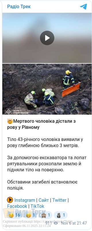 43-річного загиблого виявили у земляному рові, після чого рятувальники за допомогою екскаватора та лопат розкопали ґрунт і підняли тіло на поверхню.