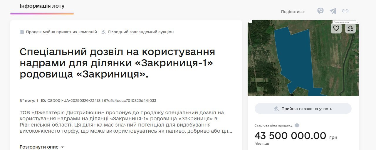Площа родовища становить понад 143 гектари. Аукціон відбудеться 25-го квітня.