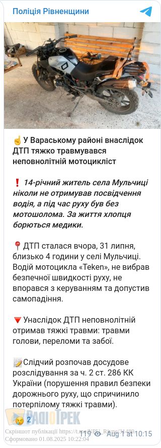 У Вараському районі внаслідок ДТП тяжко травмувався неповнолітній мотоцикліст. ДТП сталася вчора, 31 липня, у селі Мульчиці.