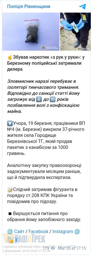 За даними правоохоронців, учора, 19 березня, чоловік продав пакетик з канабісом за 1000 гривень.