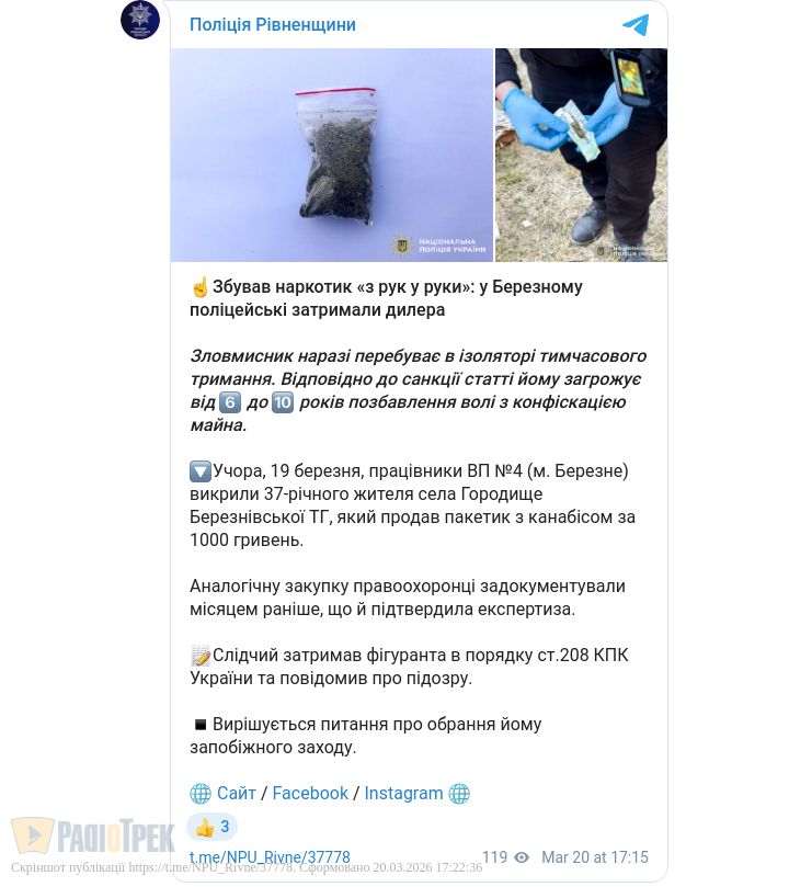 У Березному поліцейські викрили 37-річного жителя села Городище Березнівської громади, який продавав наркотики. Зловмисник наразі перебуває в ізоляторі тимчасового тримання.