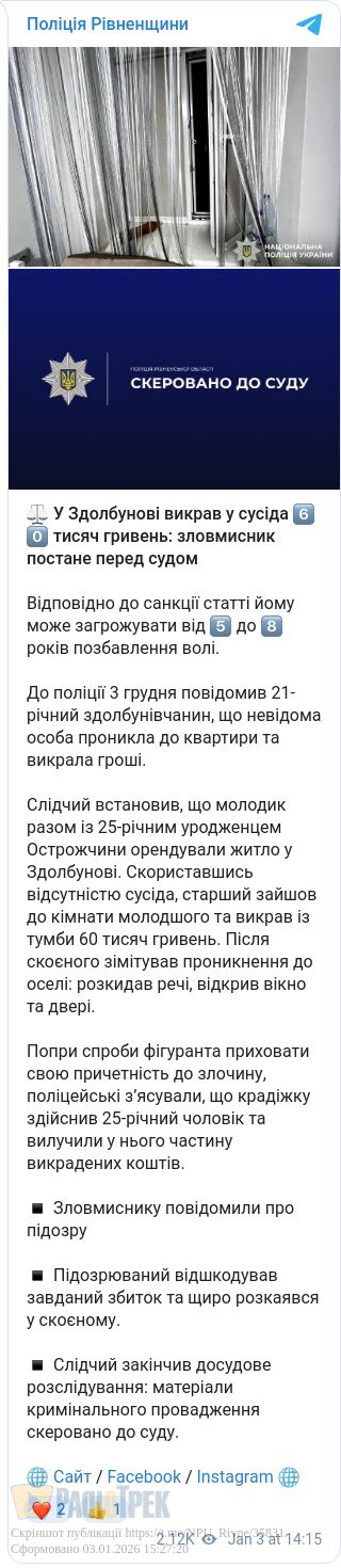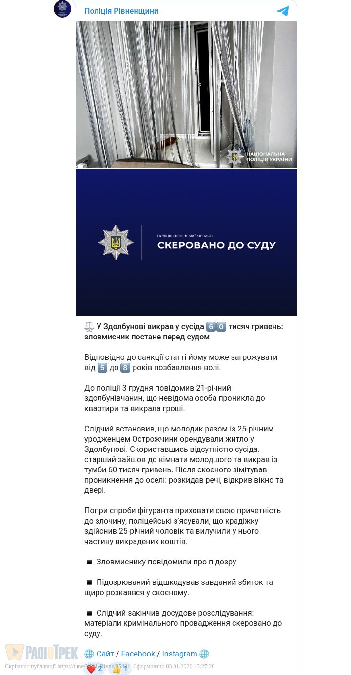 Під час слідства правоохоронці встановили, що потерпілий разом із 25-річним знайомим орендували житло у Здолбунові. Скориставшись відсутністю сусіда, старший зайшов до його кімнати та викрав гроші з тумби. Щоб приховати злочин, він зімітував проникнення — розкидав речі, відкрив вікно та двері.