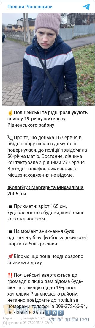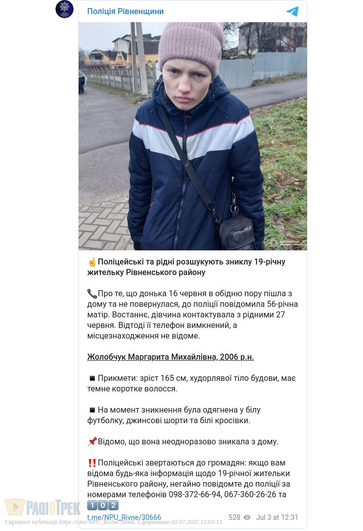 Якщо вам відома будь-яка інформація про місце перебування зниклої, повідомте на лінію 102.